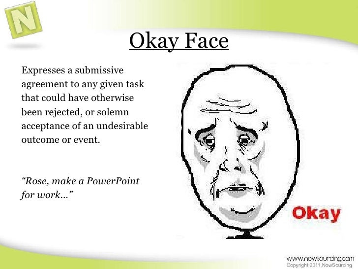 6. 6. Okay Face <ul><li>Expresses a submissive </li></ul><ul><li>agreement to any given task </li></ul><ul><li>that could have otherwise </li></ul><ul><li>been rejected, or solemn </li></ul><ul><li>acceptance of an undesirable </li></ul><ul><li>outcome or event. </li></ul><ul><li>“ Rose, make a PowerPoint </li></ul><ul><li>for work…” </li></ul>