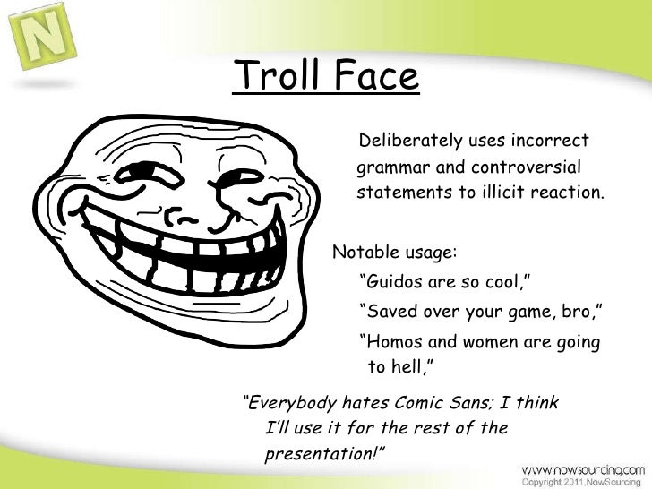 7. 7. Troll Face <ul><li>Deliberately uses incorrect grammar and controversial statements to illicit reaction. </li></ul><ul><li>Notable usage: </li></ul><ul><li>“ Guidos are so cool,” </li></ul><ul><li>“ Saved over your game, bro,” </li></ul><ul><li>“ Homos and women are going to hell,” </li></ul><ul><li>“ Everybody hates Comic Sans; I think I’ll use it for the rest of the presentation!” </li></ul>