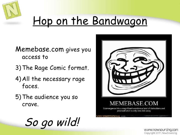 Hop on the Bandwagon <ul><li>Memebase.com  gives you access to </li></ul><ul><li>The Rage Comic format. </li></ul><ul><li>...