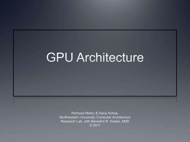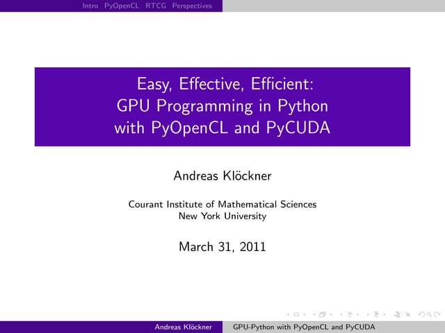 104. 104. Intro PyOpenCL What and Why? OpenCL GPU Architecture Summary Core Ideas: 1 Many slimmed down cores → lots of parallelism 2 More ALUs, Fewer Control Units 3 Avoid memory stalls by interleaving execution of SIMD groups (“warps”) Credit: Kayvon Fatahalian (Stanford) slide by Andreas Kl¨ckner o GPU-Python with PyOpenCL and PyCUDA