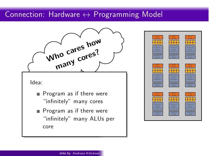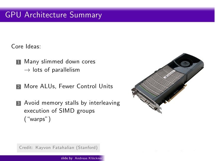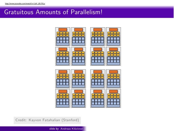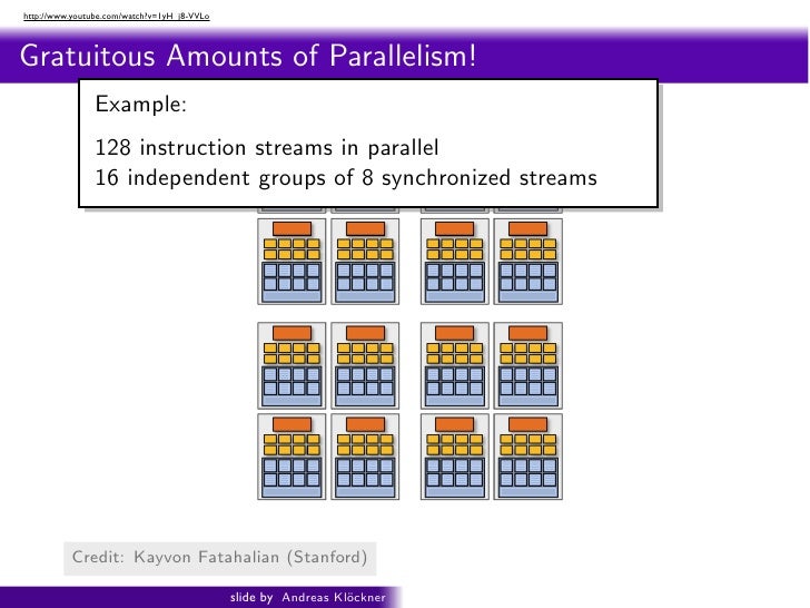 98. 98. http://www.youtube.com/watch?v=1yH_j8-VVLo Intro PyOpenCL What and Why? OpenCL Gratuitous Amounts of Parallelism! ragments in parallel 16 cores = 128 ALUs = 16 simultaneous instruction streams Credit: Shading: http://s09.idav.ucdavis.edu/ Kayvon Fatahalian (Stanford) Beyond Programmable 24 slide by Andreas Kl¨ckner o GPU-Python with PyOpenCL and PyCUDA