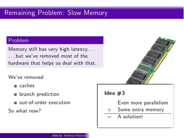 100. 100. Intro PyOpenCL What and Why? OpenCL Remaining Problem: Slow Memory Problem Memory still has very high latency. . . . . . but we’ve removed most of the hardware that helps us deal with that. We’ve removed caches branch prediction out-of-order execution So what now? slide by Andreas Kl¨ckner o GPU-Python with PyOpenCL and PyCUDA