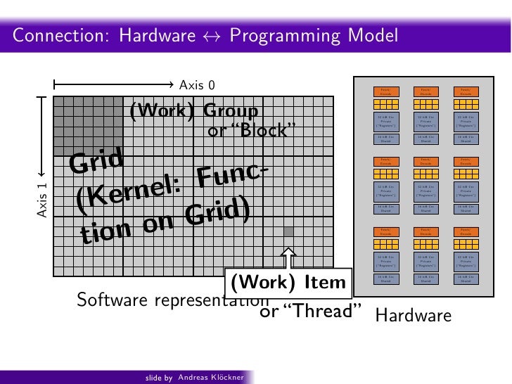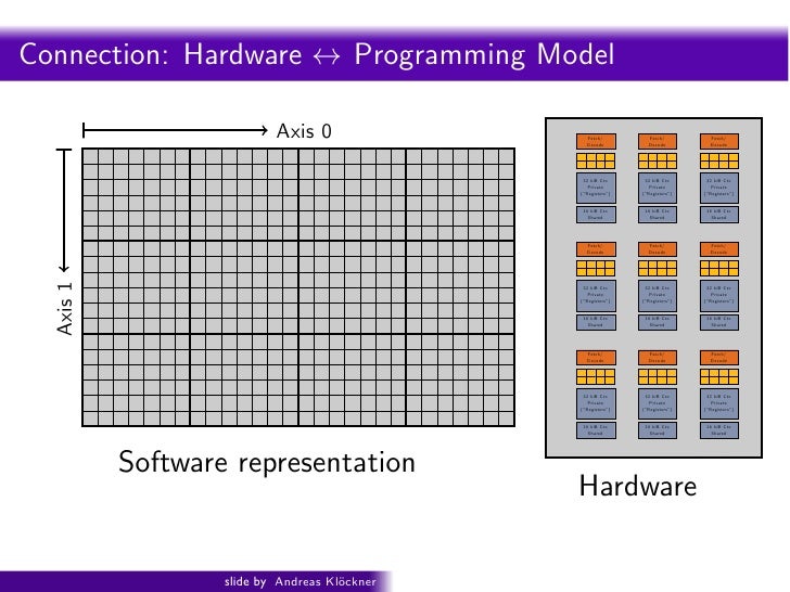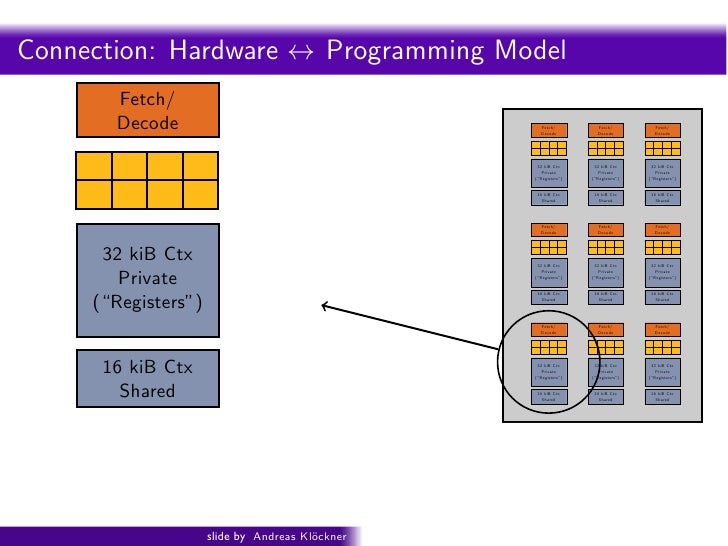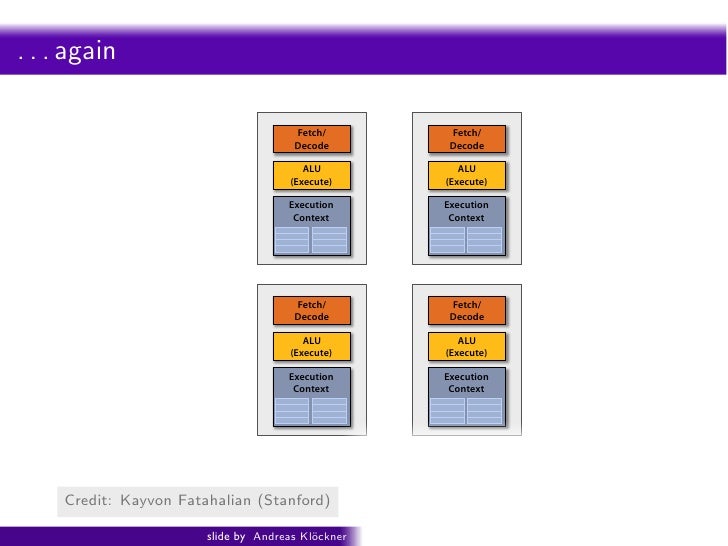 91. 91. Intro PyOpenCL What and Why? OpenCL Fouragain . . . cores (four fragments in parallel) Fetch/ Fetch/ Decode Decode ALU ALU (Execute) (Execute) Execution Execution Context Context Fetch/ Fetch/ Decode Decode ALU ALU (Execute) (Execute) Execution Execution Context Context GRAPH 2009: Beyond Programmable Shading: http://s09.idav.ucdavis.edu/ 16 Credit: Kayvon Fatahalian (Stanford) slide by Andreas Kl¨ckner o GPU-Python with PyOpenCL and PyCUDA