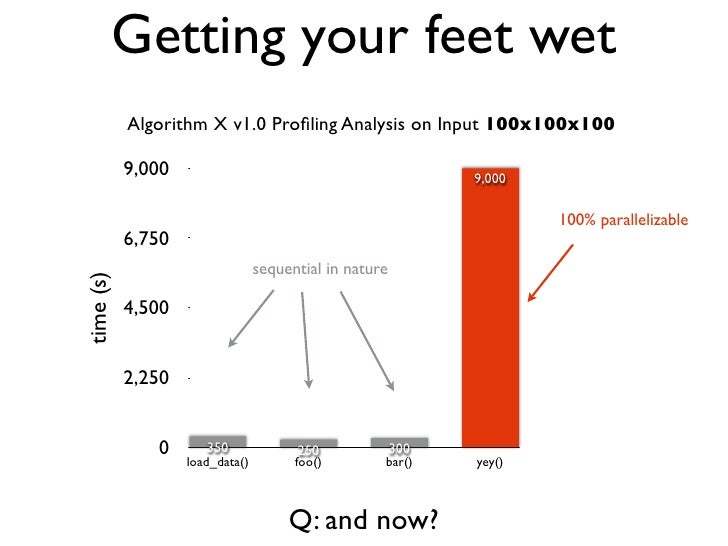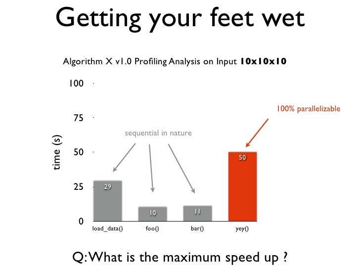 13. 13. Getting your feet wet Algorithm X v1.0 Profiling Analysis on Input 10x10x10 100 100% parallelizable 75 sequential in nature time (s) 50 50 25 29 10 11 0 load_data() foo() bar() yey() Q: What is the maximum speed up ?