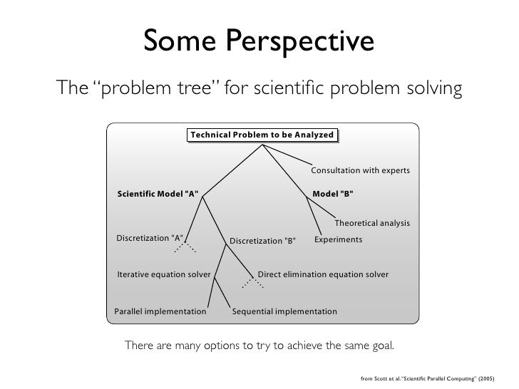 18. 18. Some Perspective The “problem tree” for scientific problem solving 9 Some Perspective Technical Problem to be Analyzed Consultation with experts Scientific Model "A" Model "B" Theoretical analysis Discretization "A" Discretization "B" Experiments Iterative equation solver Direct elimination equation solver Parallel implementation Sequential implementation Figure 11: There“problem tree” for to try to achieve the same goal. are many The are many options scientific problem solving. There options to try to achieve the same goal. from Scott et al. “Scientific Parallel Computing” (2005)
