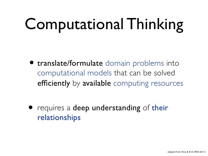 19. 19. Computational Thinking • translate/formulate domain problems into computational models that can be solved efficiently by available computing resources • requires a deep understanding of their relationships adapted from Hwu & Kirk (PASI 2011)