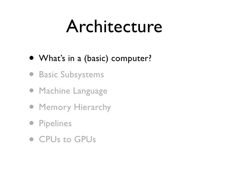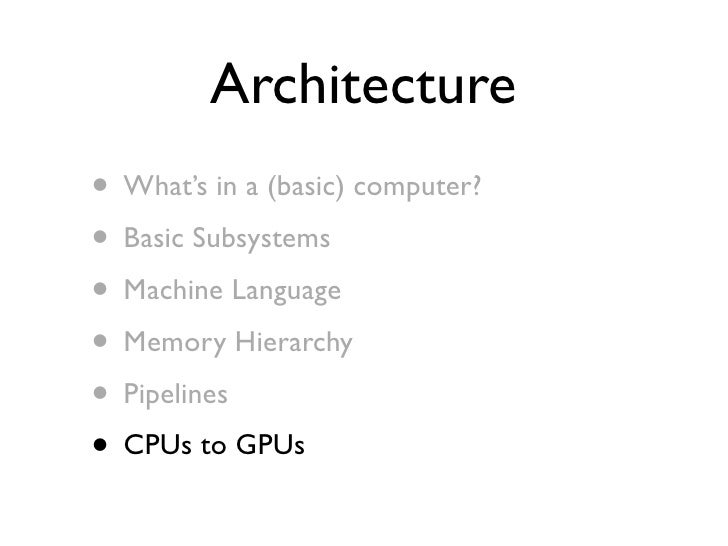 48. 48. Architecture • What’s in a (basic) computer? • Basic Subsystems • Machine Language • Memory Hierarchy • Pipelines • CPUs to GPUs