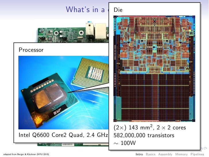 32. 32. What’s in a computer? Die Processor (2×) 143 mm2 , 2 × 2 cores Intel Q6600 Core2 Quad, 2.4 GHz 582,000,000 transistors ∼ 100W adapted from Berger & Klöckner (NYU 2010) Intro Basics Assembly Memory Pipelines