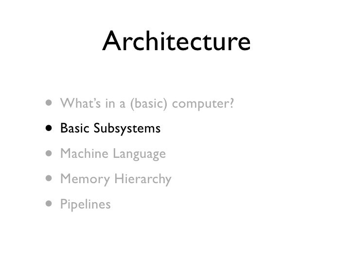 35. 35. Architecture • What’s in a (basic) computer? • Basic Subsystems • Machine Language • Memory Hierarchy • Pipelines