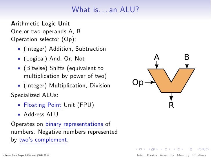 38. 38. What is. . . an ALU? Arithmetic Logic Unit One or two operands A, B Operation selector (Op): • (Integer) Addition, Subtraction • (Logical) And, Or, Not • (Bitwise) Shifts (equivalent to multiplication by power of two) • (Integer) Multiplication, Division Specialized ALUs: • Floating Point Unit (FPU) • Address ALU Operates on binary representations of numbers. Negative numbers represented by two’s complement. adapted from Berger & Klöckner (NYU 2010) Intro Basics Assembly Memory Pipelines