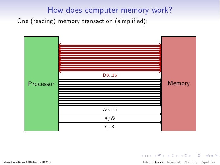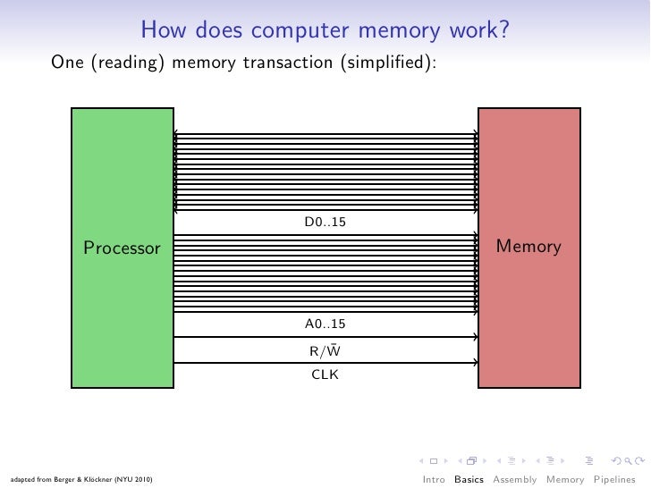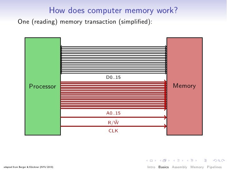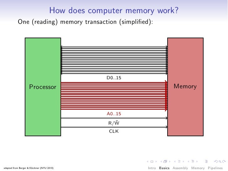 41. 41. How does computer memory work? One (reading) memory transaction (simplified): D0..15 Processor Memory A0..15 ¯ R/W CLK adapted from Berger & Klöckner (NYU 2010) Intro Basics Assembly Memory Pipelines