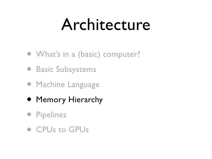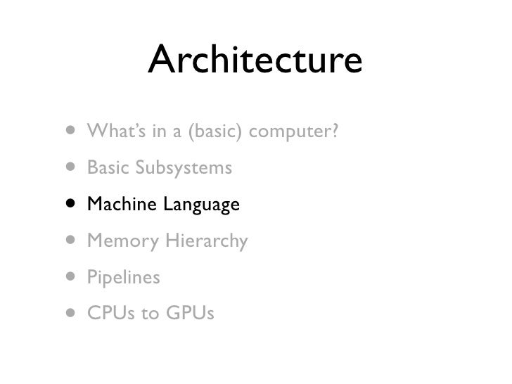75. 75. Architecture • What’s in a (basic) computer? • Basic Subsystems • Machine Language • Memory Hierarchy • Pipelines • CPUs to GPUs