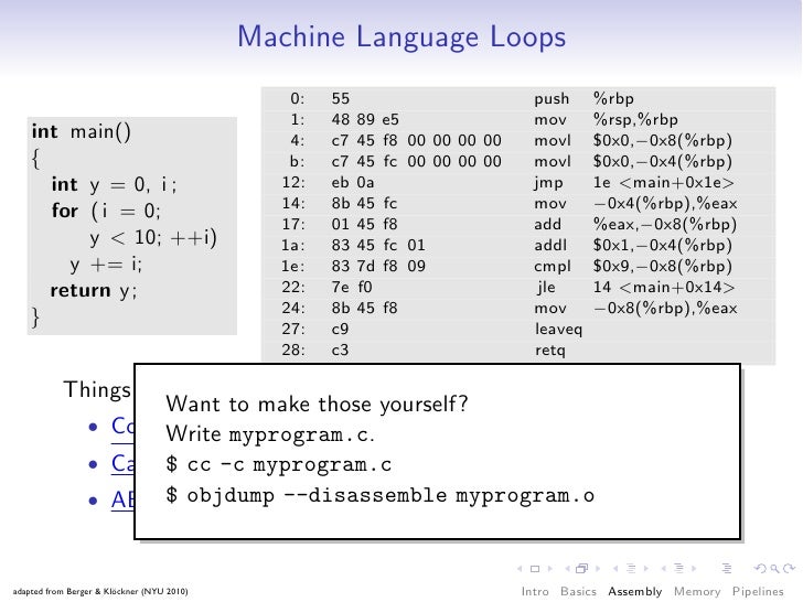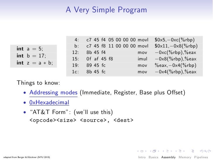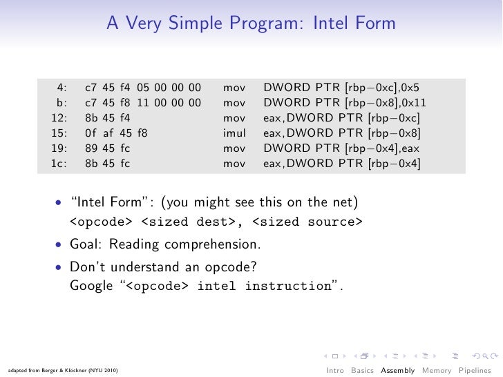 50. 50. A Very Simple Program: Intel Form 4: c7 45 f4 05 00 00 00 mov DWORD PTR [rbp−0xc],0x5 b: c7 45 f8 11 00 00 00 mov DWORD PTR [rbp−0x8],0x11 12: 8b 45 f4 mov eax,DWORD PTR [rbp−0xc] 15: 0f af 45 f8 imul eax,DWORD PTR [rbp−0x8] 19: 89 45 fc mov DWORD PTR [rbp−0x4],eax 1c: 8b 45 fc mov eax,DWORD PTR [rbp−0x4] • “Intel Form”: (you might see this on the net) <opcode> <sized dest>, <sized source> • Goal: Reading comprehension. • Don’t understand an opcode? Google “<opcode> intel instruction”. adapted from Berger & Klöckner (NYU 2010) Intro Basics Assembly Memory Pipelines