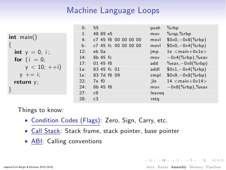 51. 51. Machine Language Loops 0: 55 push %rbp 1: 48 89 e5 mov %rsp,%rbp int main() 4: c7 45 f8 00 00 00 00 movl $0x0,−0x8(%rbp) { b: c7 45 fc 00 00 00 00 movl $0x0,−0x4(%rbp) int y = 0, i ; 12: eb 0a jmp 1e <main+0x1e> 14: 8b 45 fc mov −0x4(%rbp),%eax for ( i = 0; 17: 01 45 f8 add %eax,−0x8(%rbp) y < 10; ++i) 1a: 83 45 fc 01 addl $0x1,−0x4(%rbp) y += i; 1e: 83 7d f8 09 cmpl $0x9,−0x8(%rbp) return y; 22: 7e f0 jle 14 <main+0x14> 24: 8b 45 f8 mov −0x8(%rbp),%eax } 27: c9 leaveq 28: c3 retq Things to know: • Condition Codes (Flags): Zero, Sign, Carry, etc. • Call Stack: Stack frame, stack pointer, base pointer • ABI: Calling conventions adapted from Berger & Klöckner (NYU 2010) Intro Basics Assembly Memory Pipelines