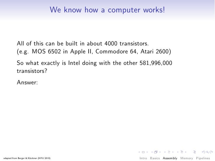 54. 54. We know how a computer works! All of this can be built in about 4000 transistors. (e.g. MOS 6502 in Apple II, Commodore 64, Atari 2600) So what exactly is Intel doing with the other 581,996,000 transistors? Answer: Make things go faster! adapted from Berger & Klöckner (NYU 2010) Intro Basics Assembly Memory Pipelines