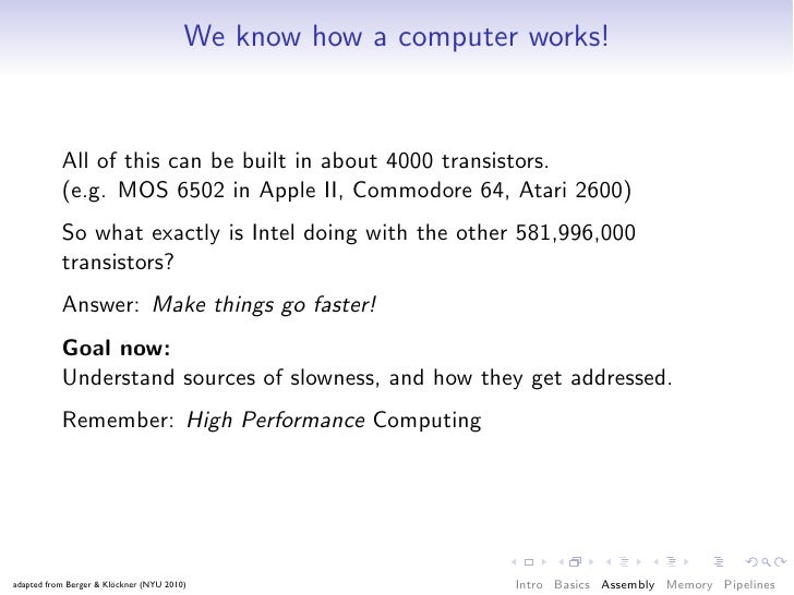 55. 55. We know how a computer works! All of this can be built in about 4000 transistors. (e.g. MOS 6502 in Apple II, Commodore 64, Atari 2600) So what exactly is Intel doing with the other 581,996,000 transistors? Answer: Make things go faster! Goal now: Understand sources of slowness, and how they get addressed. Remember: High Performance Computing adapted from Berger & Klöckner (NYU 2010) Intro Basics Assembly Memory Pipelines