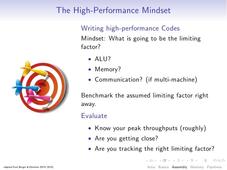 56. 56. The High-Performance Mindset Writing high-performance Codes Mindset: What is going to be the limiting factor? • ALU? • Memory? • Communication? (if multi-machine) Benchmark the assumed limiting factor right away. Evaluate • Know your peak throughputs (roughly) • Are you getting close? • Are you tracking the right limiting factor? adapted from Berger & Klöckner (NYU 2010) Intro Basics Assembly Memory Pipelines
