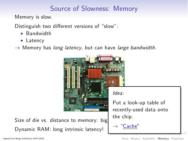 59. 59. Source of Slowness: Memory Memory is slow. Distinguish two different versions of “slow”: • Bandwidth • Latency → Memory has long latency, but can have large bandwidth. Idea: Put a look-up table of recently-used data onto the chip. Size of die vs. distance to memory: big! → “Cache” Dynamic RAM: long intrinsic latency! adapted from Berger & Klöckner (NYU 2010) Intro Basics Assembly Memory Pipelines