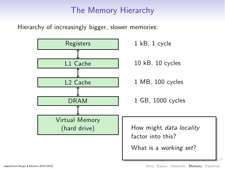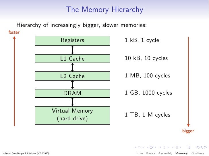 60. 60. The Memory Hierarchy Hierarchy of increasingly bigger, slower memories: faster Registers 1 kB, 1 cycle L1 Cache 10 kB, 10 cycles L2 Cache 1 MB, 100 cycles DRAM 1 GB, 1000 cycles Virtual Memory 1 TB, 1 M cycles (hard drive) bigger adapted from Berger & Klöckner (NYU 2010) Intro Basics Assembly Memory Pipelines
