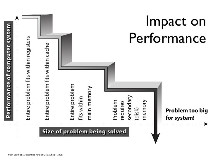 61. 61. Performance of computer system Performance of computer system Entire problem fits within registers Entire problem fits within cache from Scott et al. “Scientific Parallel Computing” (2005) Entire problem fits within main memory Problem requires Size of problem being solved Size of problem being solved secondary (disk) memory for system! Performance Impact on Problem too big