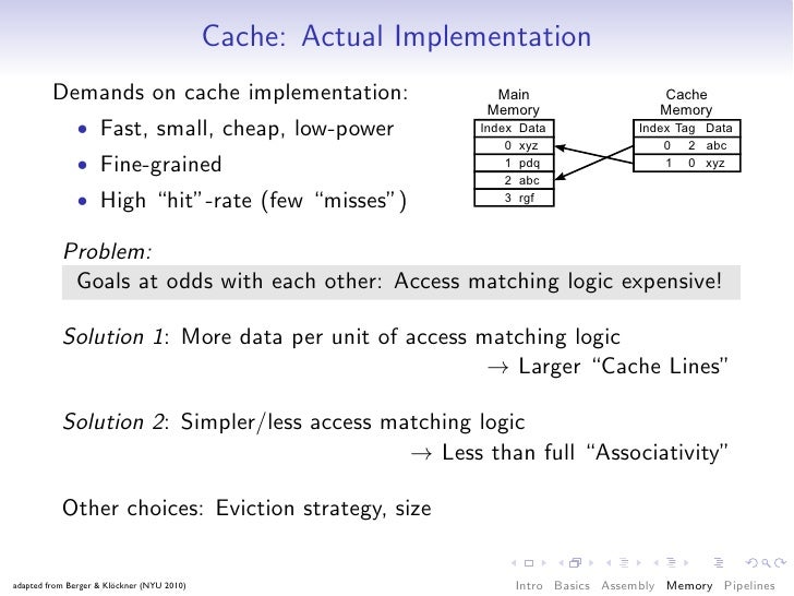 63. 63. Cache: Actual Implementation Demands on cache implementation: • Fast, small, cheap, low-power • Fine-grained • High “hit”-rate (few “misses”) Problem: Goals at odds with each other: Access matching logic expensive! Solution 1: More data per unit of access matching logic → Larger “Cache Lines” Solution 2: Simpler/less access matching logic → Less than full “Associativity” Other choices: Eviction strategy, size adapted from Berger & Klöckner (NYU 2010) Intro Basics Assembly Memory Pipelines