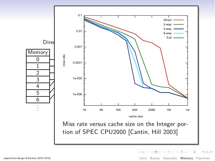 65. 65. Cache: Associativity Direct Mapped 2-way set associative Memory Cache Memory Cache 0 0 0 0 1 1 1 1 2 2 2 2 3 3 3 3 4 4 5 5 6 6 . . . . . . Miss rate versus cache size on the Integer por- tion of SPEC CPU2000 [Cantin, Hill 2003] adapted from Berger & Klöckner (NYU 2010) Intro Basics Assembly Memory Pipelines