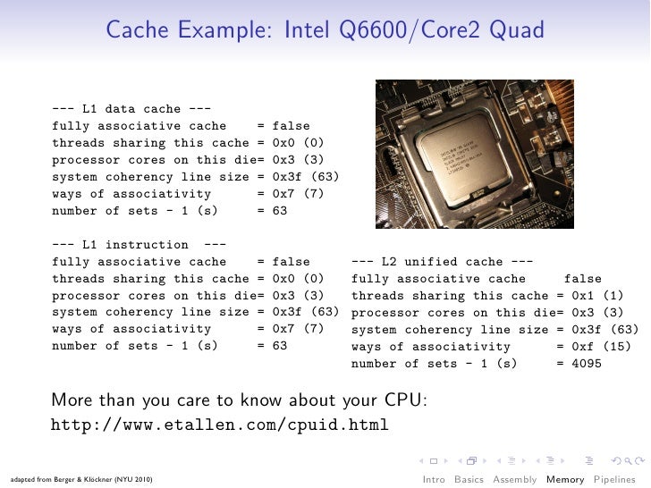 31. 31. What’s in a computer? Processor Intel Q6600 Core2 Quad, 2.4 GHz adapted from Berger & Klöckner (NYU 2010) Intro Basics Assembly Memory Pipelines