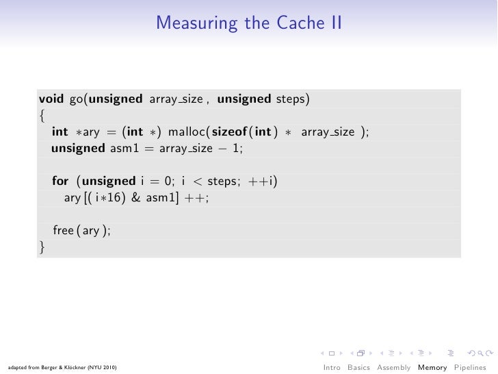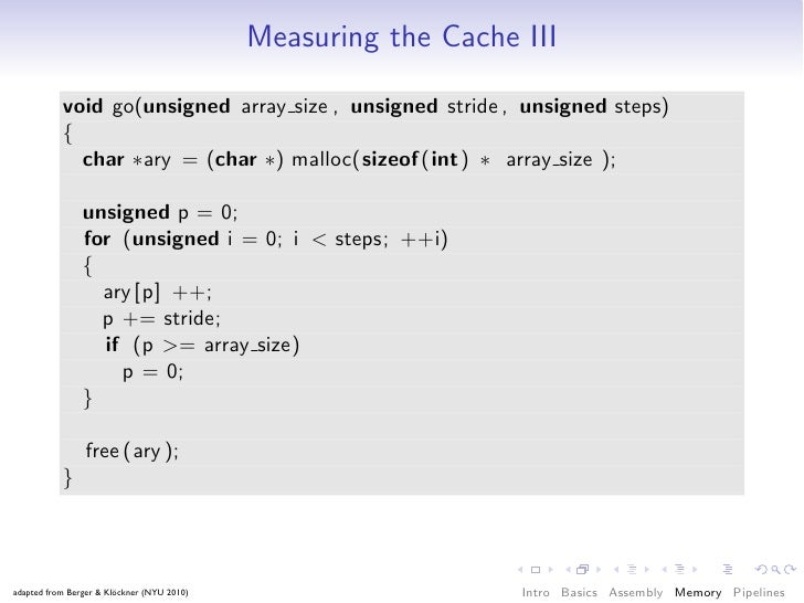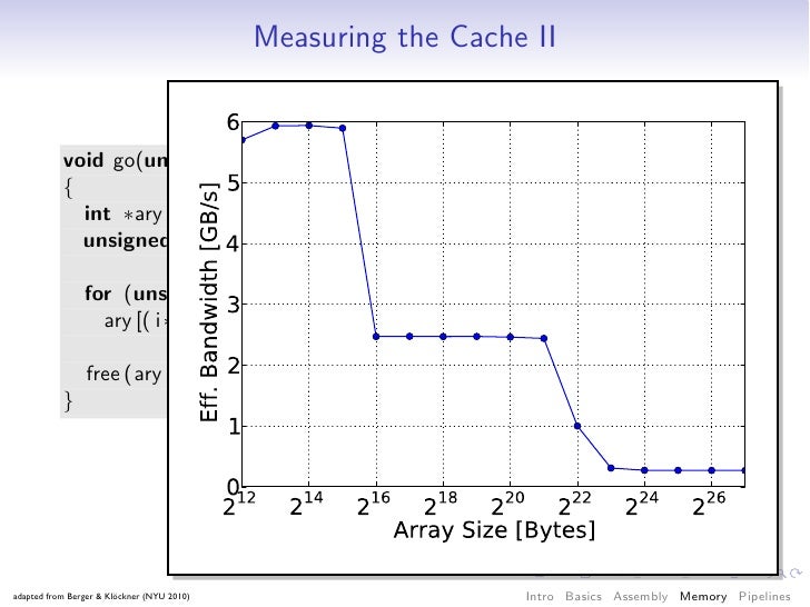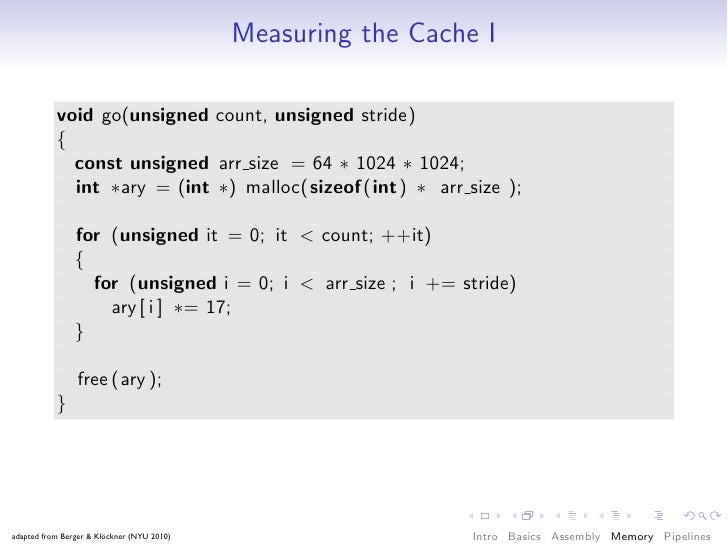 68. 68. Measuring the Cache I void go(unsigned count, unsigned stride) { const unsigned arr size = 64 ∗ 1024 ∗ 1024; int ∗ary = (int ∗) malloc(sizeof (int) ∗ arr size ); for (unsigned it = 0; it < count; ++it) { for (unsigned i = 0; i < arr size ; i += stride) ary [ i ] ∗= 17; } free (ary ); } adapted from Berger & Klöckner (NYU 2010) Intro Basics Assembly Memory Pipelines