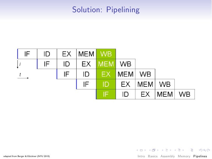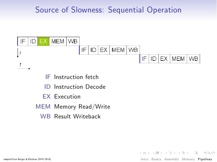 76. 76. Source of Slowness: Sequential Operation IF Instruction fetch ID Instruction Decode EX Execution MEM Memory Read/Write WB Result Writeback adapted from Berger & Klöckner (NYU 2010) Intro Basics Assembly Memory Pipelines