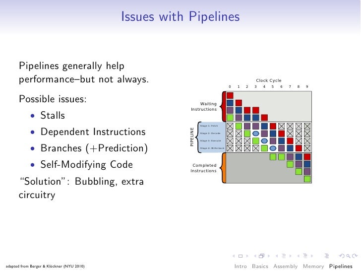 79. 79. Issues with Pipelines Pipelines generally help performance–but not always. Possible issues: • Stalls • Dependent Instructions • Branches (+Prediction) • Self-Modifying Code “Solution”: Bubbling, extra circuitry adapted from Berger & Klöckner (NYU 2010) Intro Basics Assembly Memory Pipelines