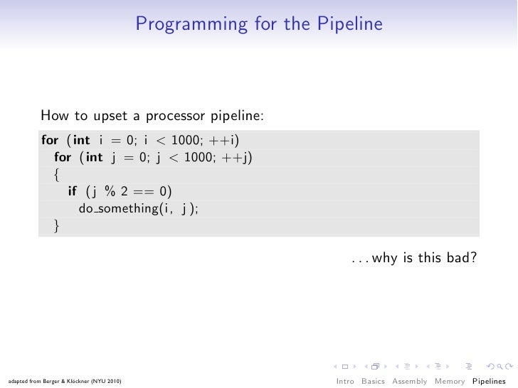 82. 82. Programming for the Pipeline How to upset a processor pipeline: for (int i = 0; i < 1000; ++i) for (int j = 0; j < 1000; ++j) { if ( j % 2 == 0) do something(i , j ); } . . . why is this bad? adapted from Berger & Klöckner (NYU 2010) Intro Basics Assembly Memory Pipelines