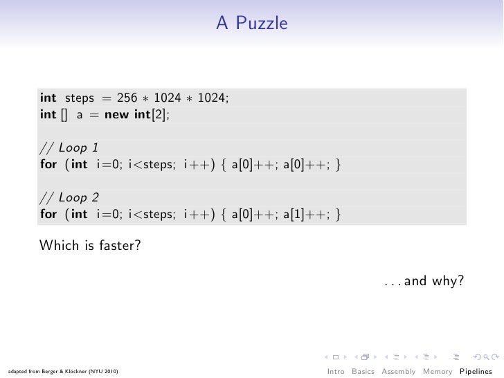 83. 83. A Puzzle int steps = 256 ∗ 1024 ∗ 1024; int [] a = new int[2]; // Loop 1 for (int i =0; i<steps; i ++) { a[0]++; a[0]++; } // Loop 2 for (int i =0; i<steps; i ++) { a[0]++; a[1]++; } Which is faster? . . . and why? adapted from Berger & Klöckner (NYU 2010) Intro Basics Assembly Memory Pipelines