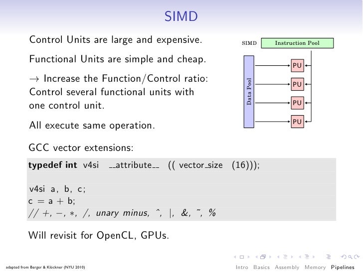 85. 85. SIMD Control Units are large and expensive. SIMD Instruction Pool Functional Units are simple and cheap. → Increase the Function/Control ratio: Data Pool Control several functional units with one control unit. All execute same operation. GCC vector extensions: typedef int v4si attribute (( vector size (16))); v4si a, b, c; c = a + b; // +, −, ∗, /, unary minus, ˆ, |, &, ˜, % Will revisit for OpenCL, GPUs. adapted from Berger & Klöckner (NYU 2010) Intro Basics Assembly Memory Pipelines