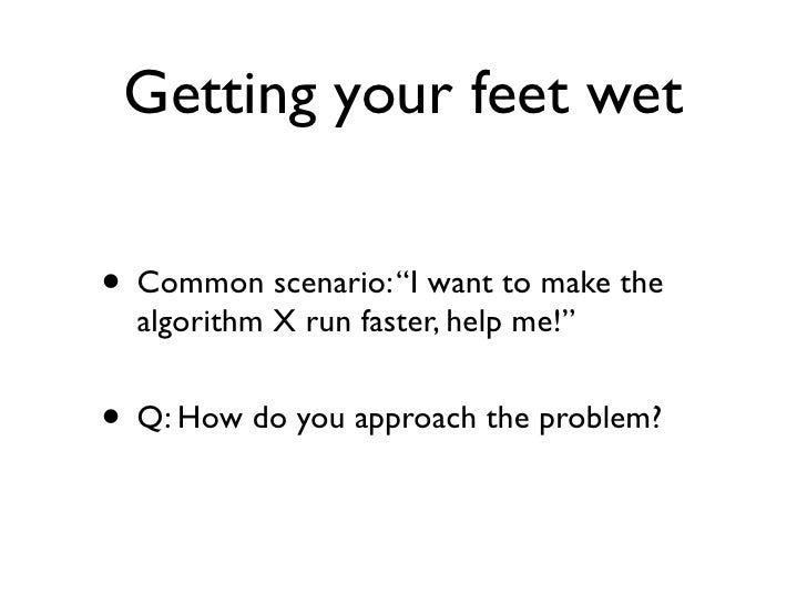 8. 8. Getting your feet wet • Common scenario: “I want to make the algorithm X run faster, help me!” • Q: How do you approach the problem?