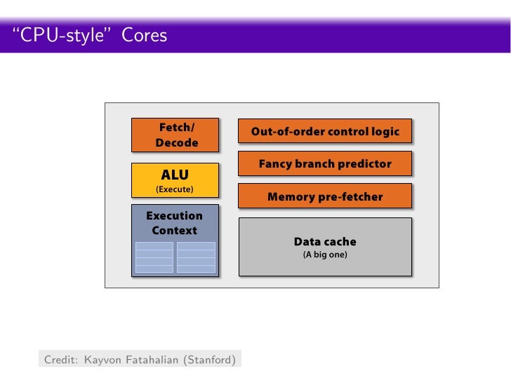 88. 88. Intro PyOpenCL What and Why? OpenCL “CPU-style” Cores CPU-“style” cores Fetch/ Out-of-order control logic Decode Fancy branch predictor ALU (Execute) Memory pre-fetcher Execution Context Data cache (A big one) SIGGRAPH 2009: Beyond Programmable Shading: http://s09.idav.ucdavis.edu/ 13 Credit: Kayvon Fatahalian (Stanford)
