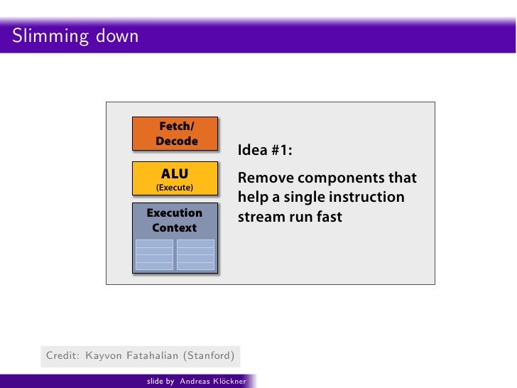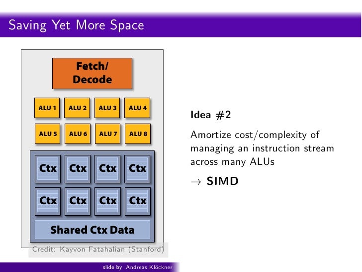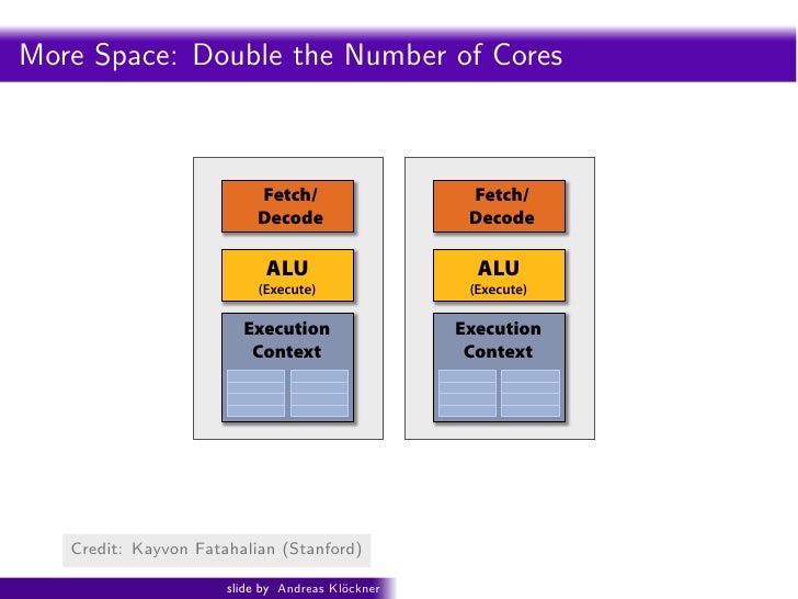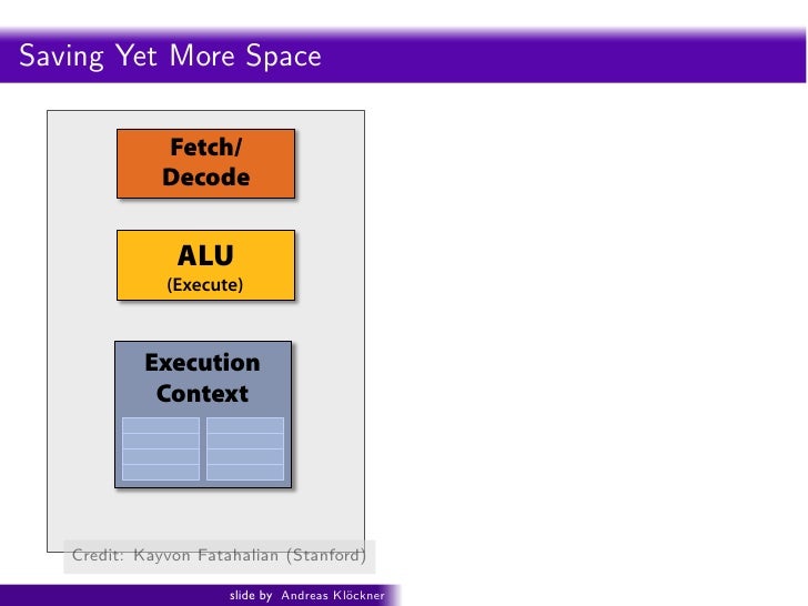 94. 94. ecall: simple processing core Intro PyOpenCL What and Why? OpenCL Saving Yet More Space Fetch/ Decode ALU (Execute) Execution Context Credit: Kayvon Fatahalian (Stanford) slide by Andreas Kl¨ckner o GPU-Python with PyOpenCL and PyCUDA