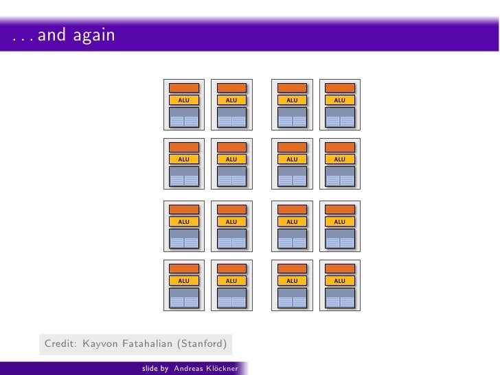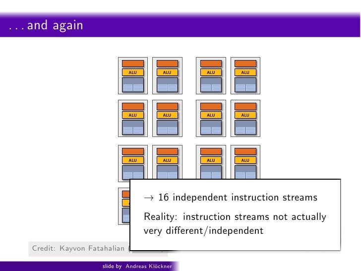 92. 92. Intro PyOpenCL What and Why? OpenCL xteen cores . . . and again (sixteen fragments in parallel) ALU ALU ALU ALU ALU ALU ALU ALU ALU ALU ALU ALU ALU ALU ALU ALU 16 cores = 16 simultaneous instruction streams H 2009: Beyond Programmable Shading: http://s09.idav.ucdavis.edu/ Credit: Kayvon Fatahalian (Stanford) 17 slide by Andreas Kl¨ckner o GPU-Python with PyOpenCL and PyCUDA
