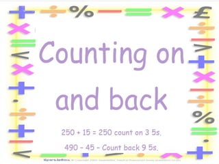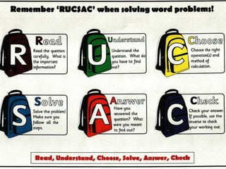 This document outlines different mental math strategies and provides examples of how they can be used to solve word problems. It discusses counting on or back, rounding and adjusting, partitioning, re-ordering, inverse operations, and factors. It then describes how students in different year levels demonstrate these strategies. For example, year 2 students use counting on, year 3 uses re-ordering, and year 6 solves a word problem using a strategy and the RUCSAC procedure to show their work.