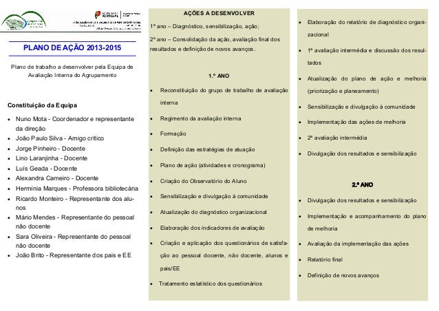 2. 2. AÇÕES A DESENVOLVER 1º ano – Diagnóstico, sensibilização, ação;  zacional 2º ano – Consolidação da ação, avaliação final dos PLANO DE AÇÃO 2013-2015 resultados e definição de novos avanços. 1.º ANO   João Paulo Silva - Amigo crítico  Jorge Pinheiro - Docente  Luís Geada - Docente  Alexandra Carneiro - Docente  Ricardo Monteiro - Representante dos alunos  Mário Mendes - Representante do pessoal não docente 1ª avaliação intermédia e discussão dos resul- Regimento da avaliação interna  Formação  Definição das estratégias de atuação  Sensibilização e divulgação à comunidade  Atualização do diagnóstico organizacional  Criação e aplicação dos questionários de satisfa- Sensibilização e divulgação à comunidade  Implementação das ações de melhoria  2ª avaliação intermédia  Divulgação dos resultados e sensibilização Elaboração dos indicadores de avaliação   Criação do Observatório do Aluno  (priorização e planeamento) Plano de ação (atividades e cronograma)  Atualização do plano de ação e melhoria Hermínia Marques - Professora bibliotecária   Lino Laranjinha - Docente   Reconstituição do grupo de trabalho de avaliação interna Constituição da Equipa Nuno Mota - Coordenador e representante da direção  tados Plano de trabalho a desenvolver pela Equipa de Avaliação Interna do Agrupamento  Elaboração do relatório de diagnóstico organi-   Sara Oliveira - Representante do pessoal não docente 2.º ANO  Divulgação dos resultados e sensibilização  Implementação e acompanhamento do plano de melhoria Avaliação da implementação das ações  Relatório final  ção ao pessoal docente, não docente, alunos e João Brito - Representante dos pais e EE  Definição de novos avanços pais/EE  Tratamento estatístico dos questionários