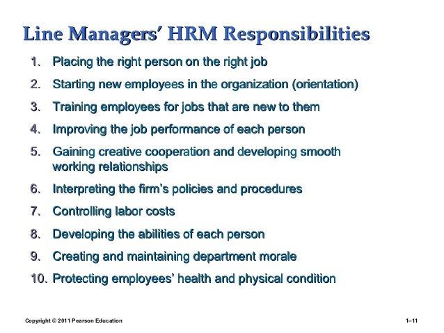 11. 11. Line Managers’ HRM Responsibilities 1. Placing the right person on the right job 2. Starting new employees in the organization (orientation) 3. Training employees for jobs that are new to them 4. Improving the job performance of each person 5. Gaining creative cooperation and developing smooth working relationships 6. Interpreting the firm’s policies and procedures 7. Controlling labor costs 8. Developing the abilities of each person 9. Creating and maintaining department morale 10. Protecting employees’ health and physical conditionCopyright © 2011 Pearson Education 1–11