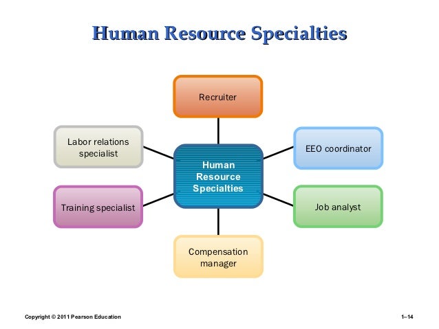 14. 14. Human Resource Specialties Recruiter Labor relations specialist EEO coordinator Human Resource Specialties Training specialist Job analyst Compensation managerCopyright © 2011 Pearson Education 1–14