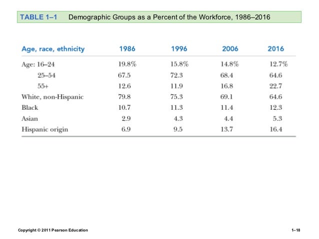 18. 18. TABLE 1–1 Demographic Groups as a Percent of the Workforce, 1986–2016Copyright © 2011 Pearson Education 1–18