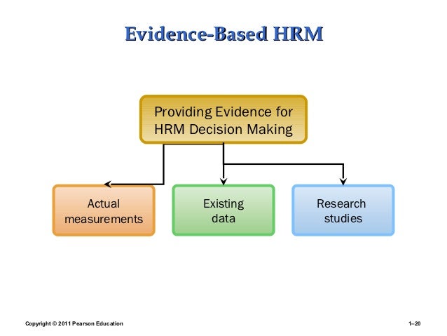 20. 20. Evidence-Based HRM Providing Evidence for HRM Decision Making Actual Existing Research measurements data studiesCopyright © 2011 Pearson Education 1–20