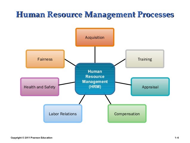 6. 6. Human Resource Management Processes Acquisition Fairness Training Human Resource Management Health and Safety (HRM) Appraisal Labor Relations CompensationCopyright © 2011 Pearson Education 1–6