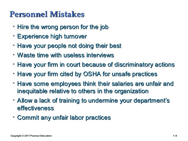 8. 8. Personnel Mistakes • Hire the wrong person for the job • Experience high turnover • Have your people not doing their best • Waste time with useless interviews • Have your firm in court because of discriminatory actions • Have your firm cited by OSHA for unsafe practices • Have some employees think their salaries are unfair and inequitable relative to others in the organization • Allow a lack of training to undermine your department’s effectiveness • Commit any unfair labor practicesCopyright © 2011 Pearson Education 1–8