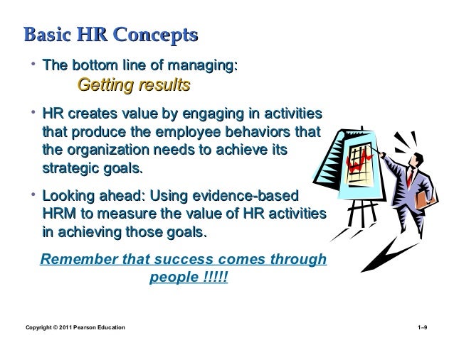 9. 9. Basic HR Concepts • The bottom line of managing: Getting results • HR creates value by engaging in activities that produce the employee behaviors that the organization needs to achieve its strategic goals. • Looking ahead: Using evidence-based HRM to measure the value of HR activities in achieving those goals. Remember that success comes through people !!!!!Copyright © 2011 Pearson Education 1–9