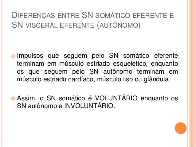 10. 10. DIFERENÇAS ENTRE SN SOMÁTICO EFERENTE E SN VISCERAL EFERENTE (AUTÔNOMO)  Impulsos que seguem pelo SN somático eferente terminam em músculo estriado esquelético, enquanto os que seguem pelo SN autônomo terminam em músculo estriado cardíaco, músculo liso ou glândula.  Assim, o SN somático é VOLUNTÁRIO enquanto os SN autônomo e INVOLUNTÁRIO.