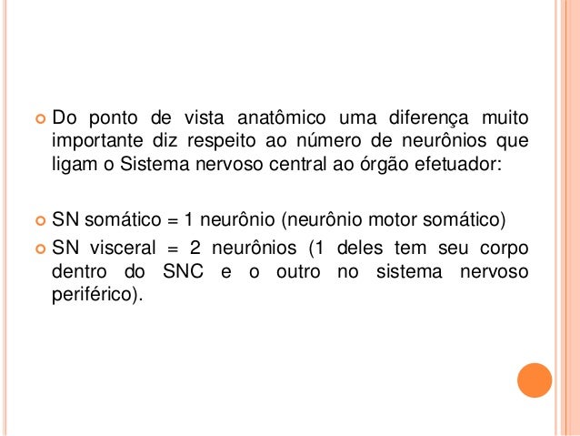 11. 11.  Do ponto de vista anatômico uma diferença muito importante diz respeito ao número de neurônios que ligam o Sistema nervoso central ao órgão efetuador:  SN somático = 1 neurônio (neurônio motor somático)  SN visceral = 2 neurônios (1 deles tem seu corpo dentro do SNC e o outro no sistema nervoso periférico).