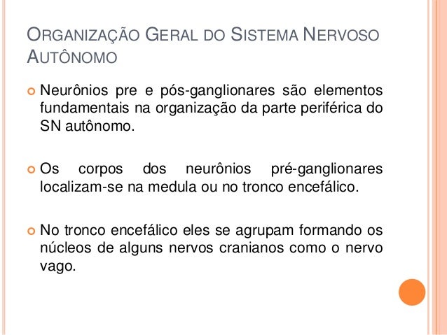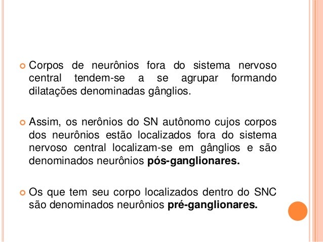 12. 12.  Corpos de neurônios fora do sistema nervoso central tendem-se a se agrupar formando dilatações denominadas gânglios.  Assim, os nerônios do SN autônomo cujos corpos dos neurônios estão localizados fora do sistema nervoso central localizam-se em gânglios e são denominados neurônios pós-ganglionares.  Os que tem seu corpo localizados dentro do SNC são denominados neurônios pré-ganglionares.