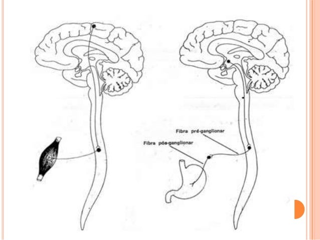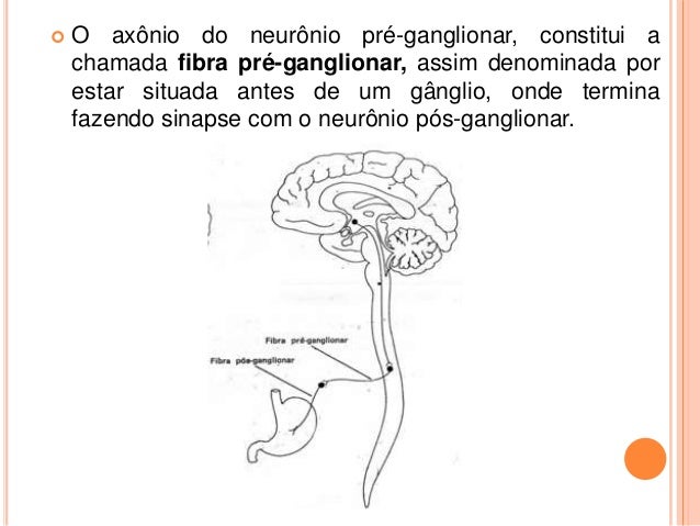 16. 16.  O axônio do neurônio pré-ganglionar, constitui a chamada fibra pré-ganglionar, assim denominada por estar situada antes de um gânglio, onde termina fazendo sinapse com o neurônio pós-ganglionar.